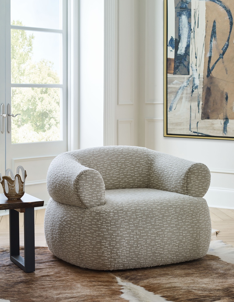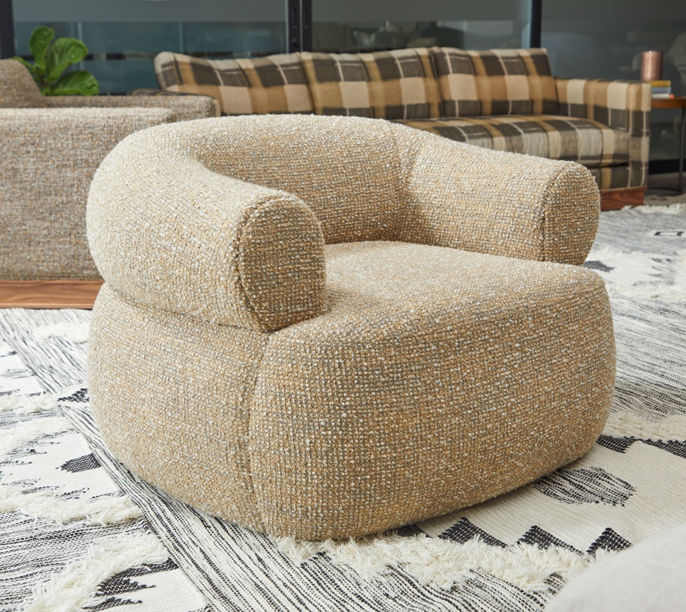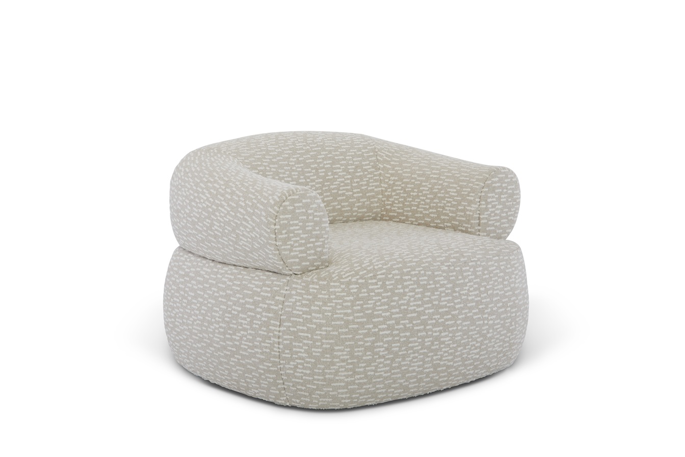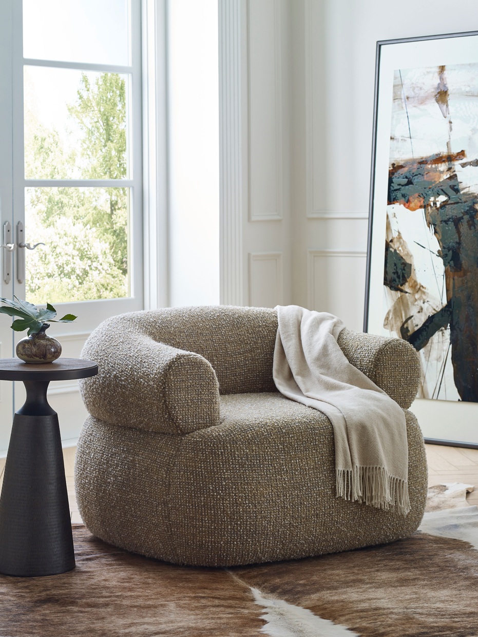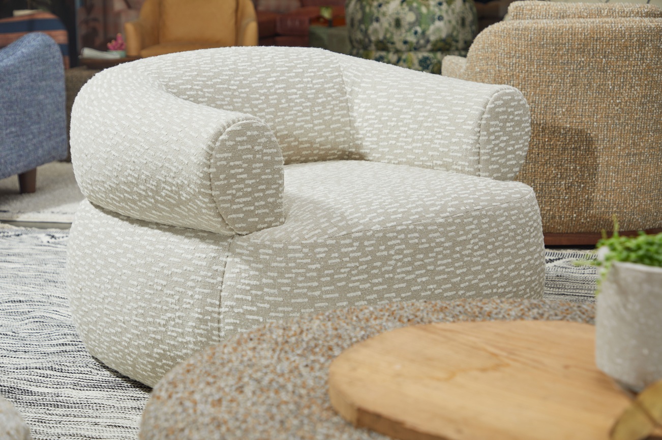 Daintier than the Ollie, the Rue swivel chair is a plush, feminine style. The curve of the rolled back hugs all who sit in it, while the swivel offers a 360 degree view of the room. This is a design that wants to be in on the action.